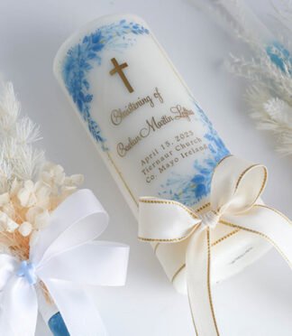 – 1 pillar candle size 8cm x 30cm, with customized printing, decorated with ribbon.