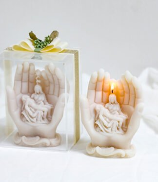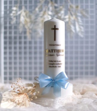 – 1 pillar candle size 8cm x 30cm, with customized printing.