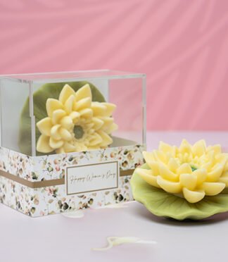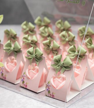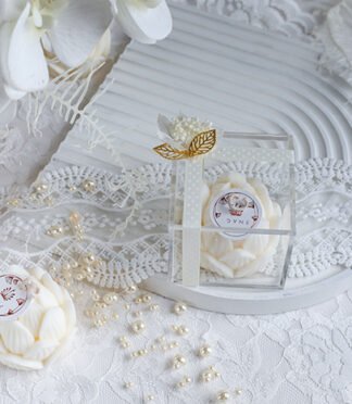 The soap bar comes with a ribbon, flower accessory, and a greeting card on the top.