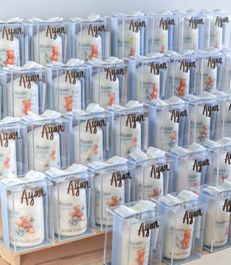 The packaging comes in a clear acrylic box size 10cm x 10cm x 12cm, with ribbon, acrylic baby name and greeting card.