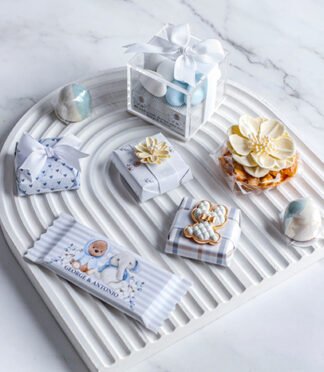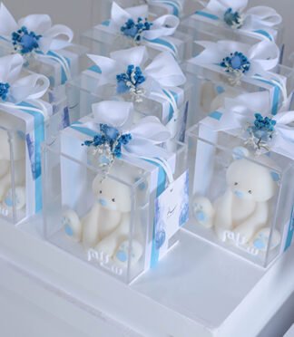 – 10 acrylic boxes filled with blue dragees (chocolate coated sugar)