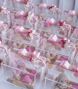 The packaging comes in a clear acrylic box size 10cm x 10cm x 10cm, with an acrylic baby name, ribbon, dry flowers, and a greeting card.
