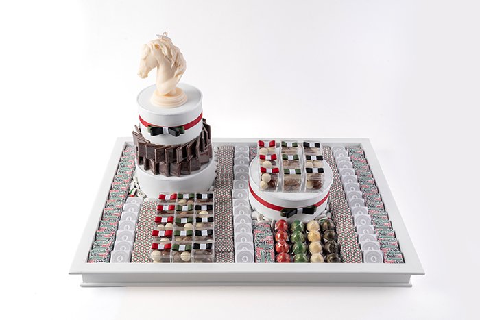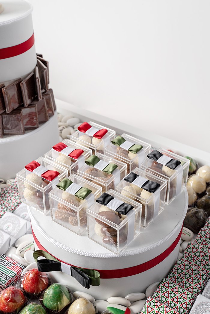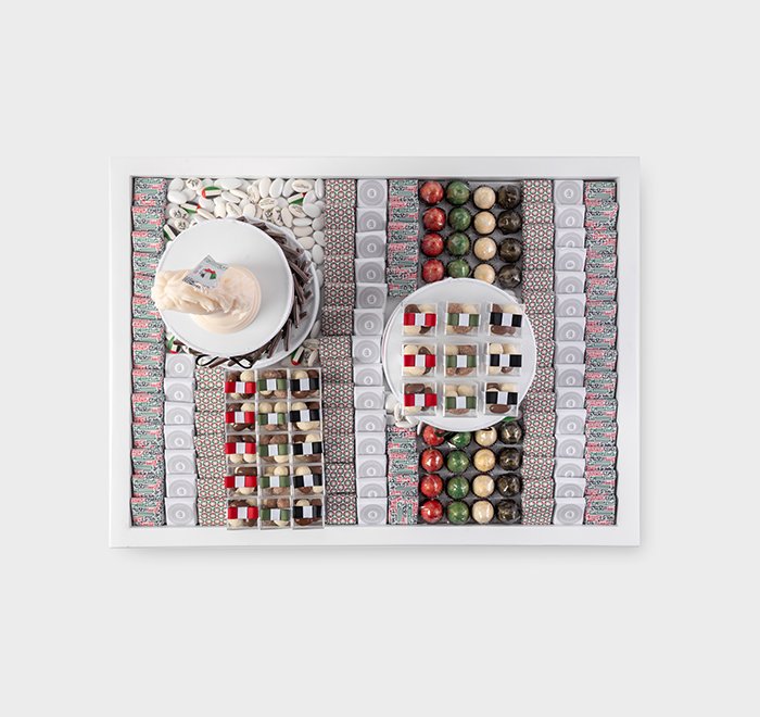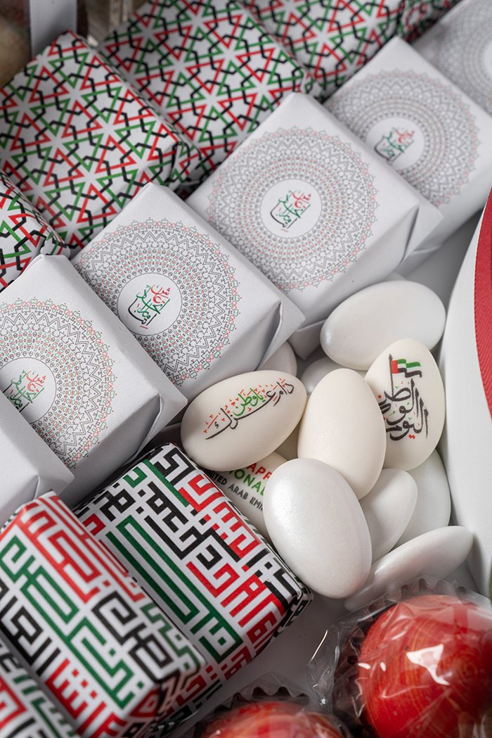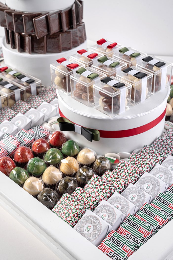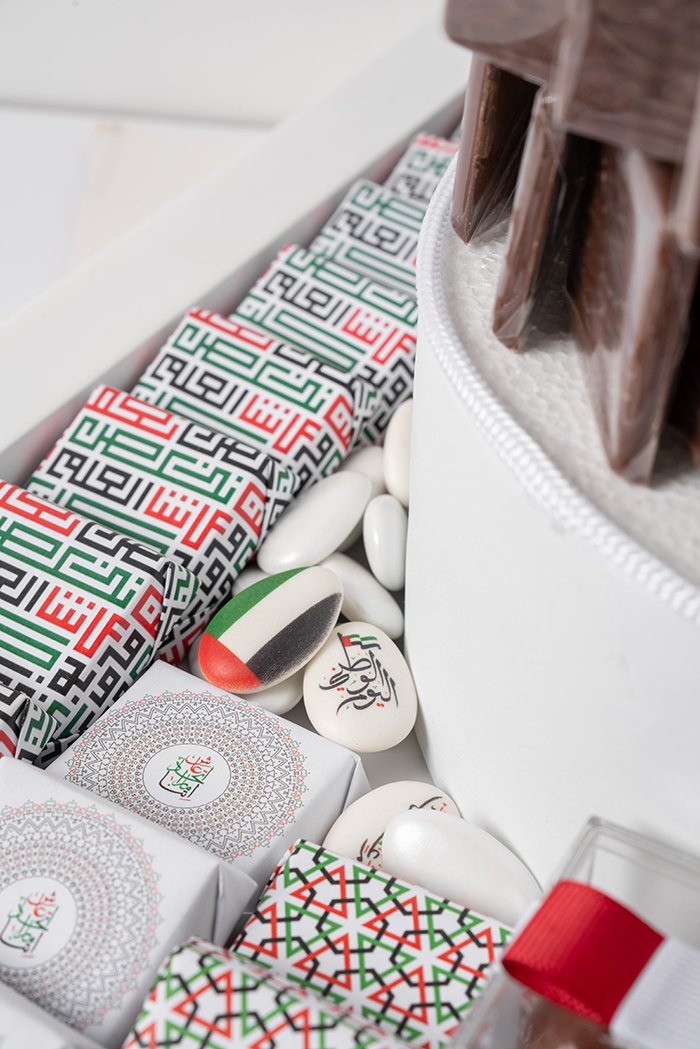 -22 dragee box (nuts coated chocolate) (size 4cm x 4cm) decorated with UAE Flag colors.