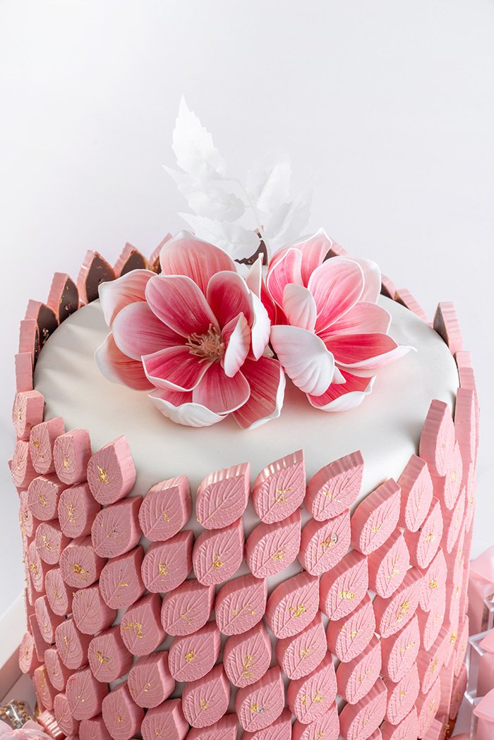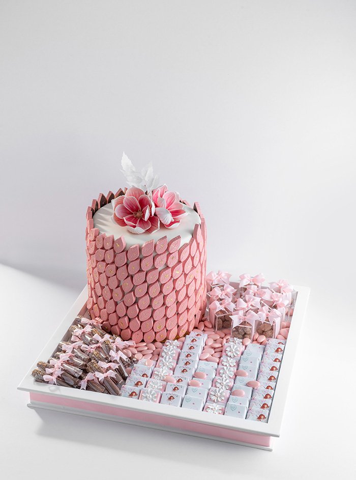– 2 KG of Belgian chocolates in pistachio filling as a pink tower in pink leaf shape.