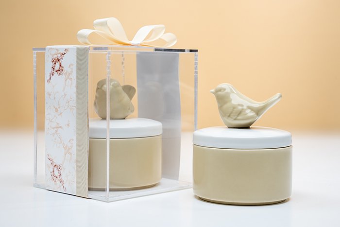 The packaging comes in a clear acrylic box size 10cm x 10cm x 12cm, with a customized sleeve, ribbon, and greeting card