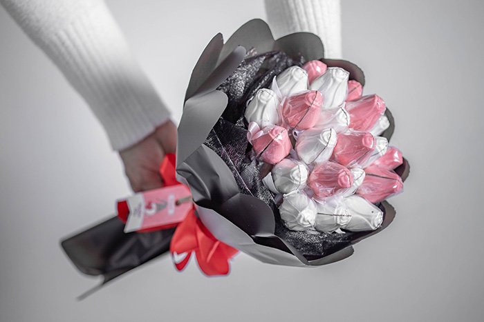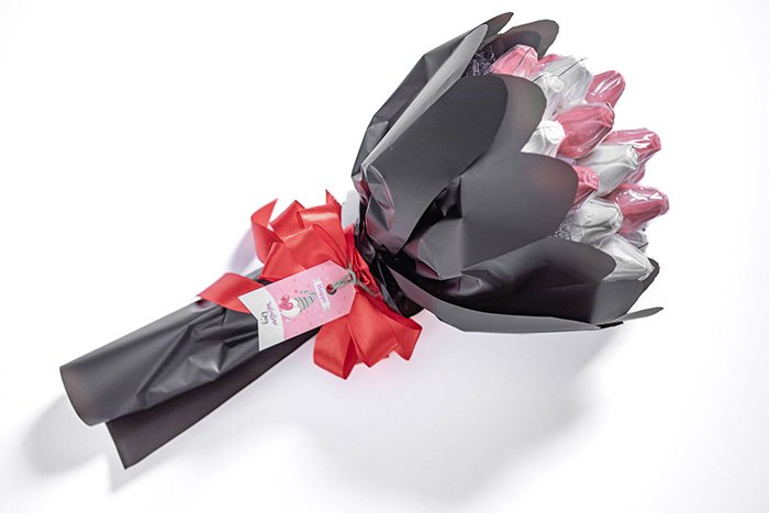 20 pieces of flower chocolate in a round bouquet with black paper.