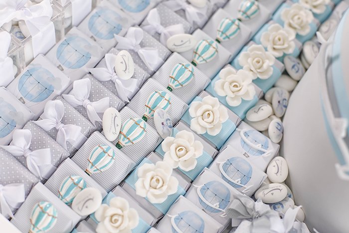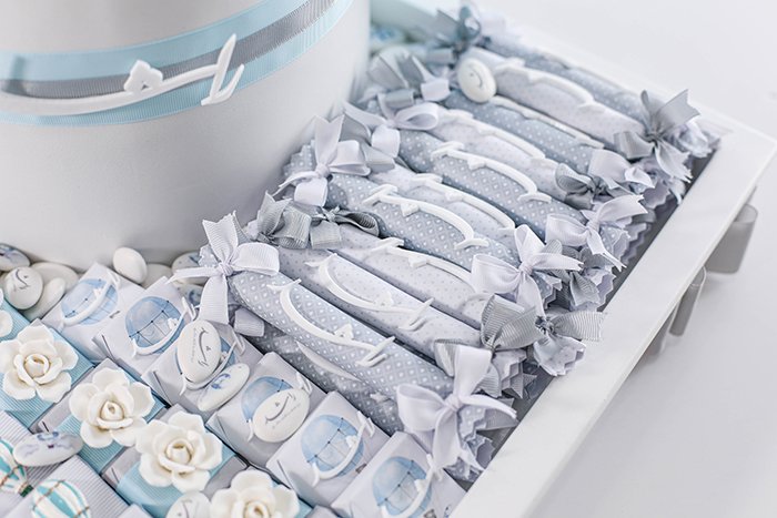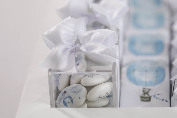 – 15 boxes of printed dragee (chocolate-coated sugar) decorated with light pink ribbon.