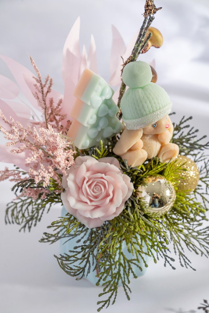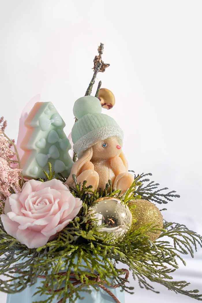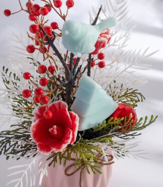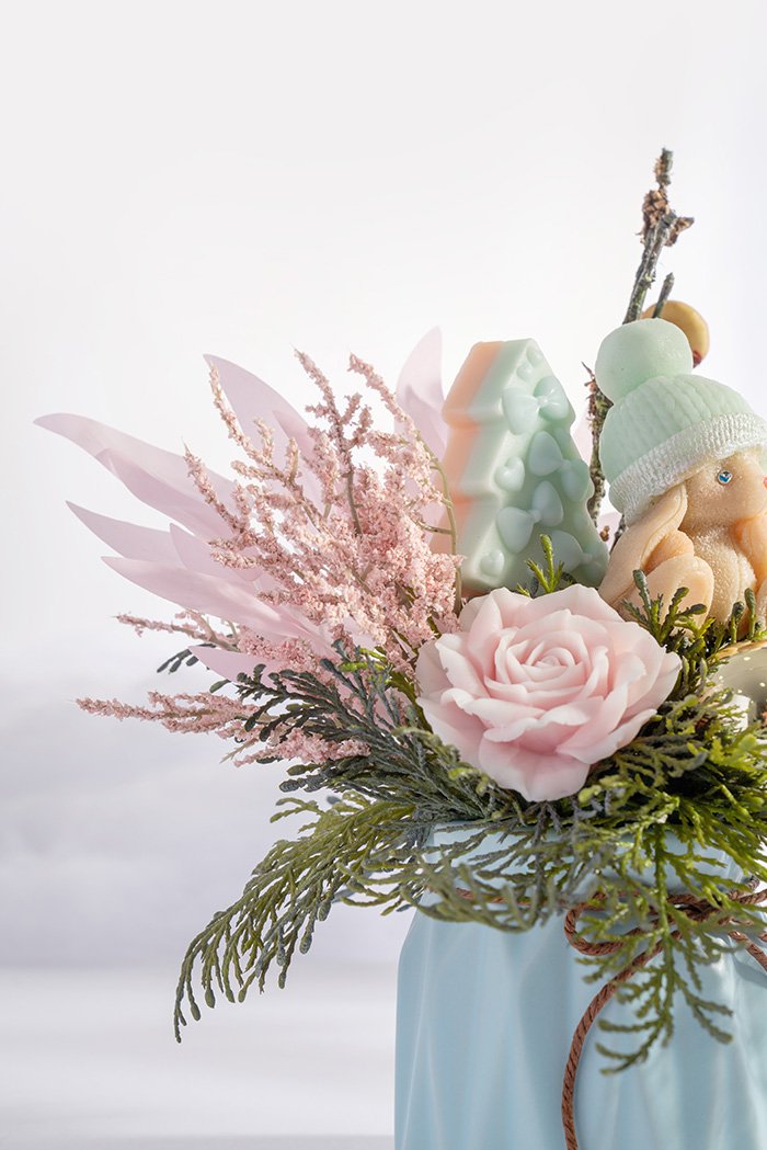 Blue gypsum vase with Christmas decorations and four pieces of natural scented soap.