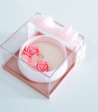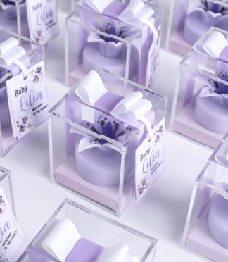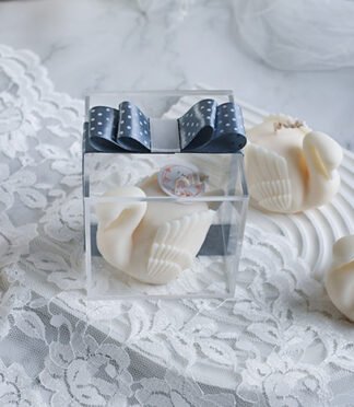 white box size 9cm x 5cm decorated with ribbon and tag.