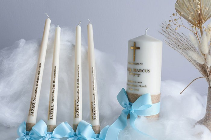 – 1 pillar candle size 8cm x 30cm, with customized gold foil printing, decorated with ribbon.