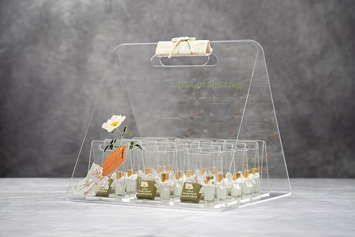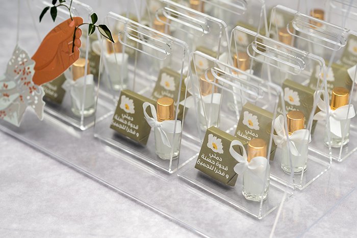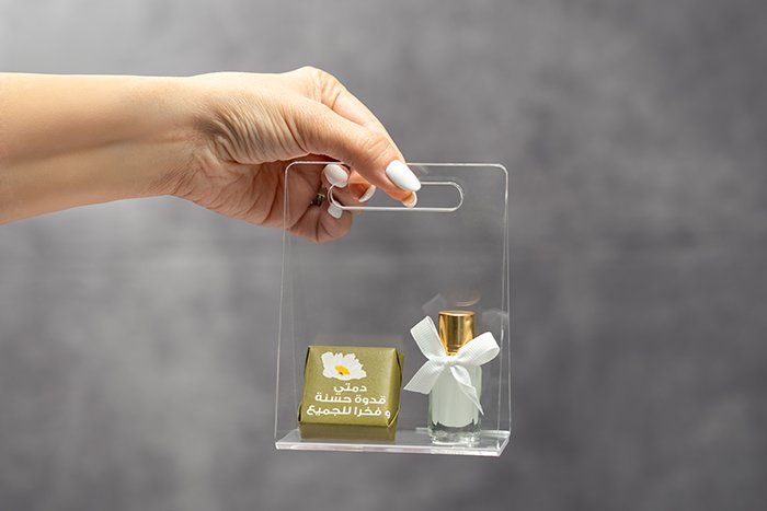 15 acrylic bags. Each one has a piece of Belguim chocolate and a white musk bottle.