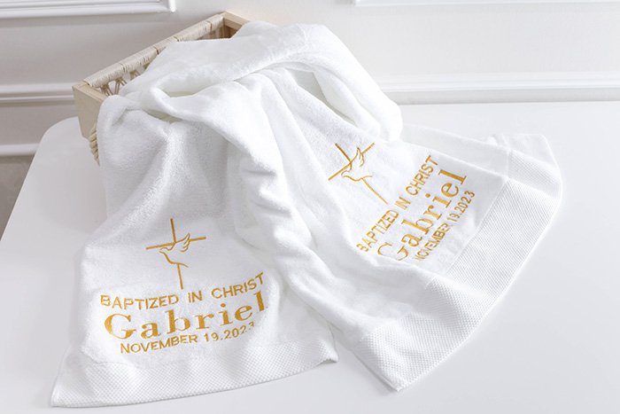 Cotton towel size 70cm x 140cm, with customized embroidery in gold color.