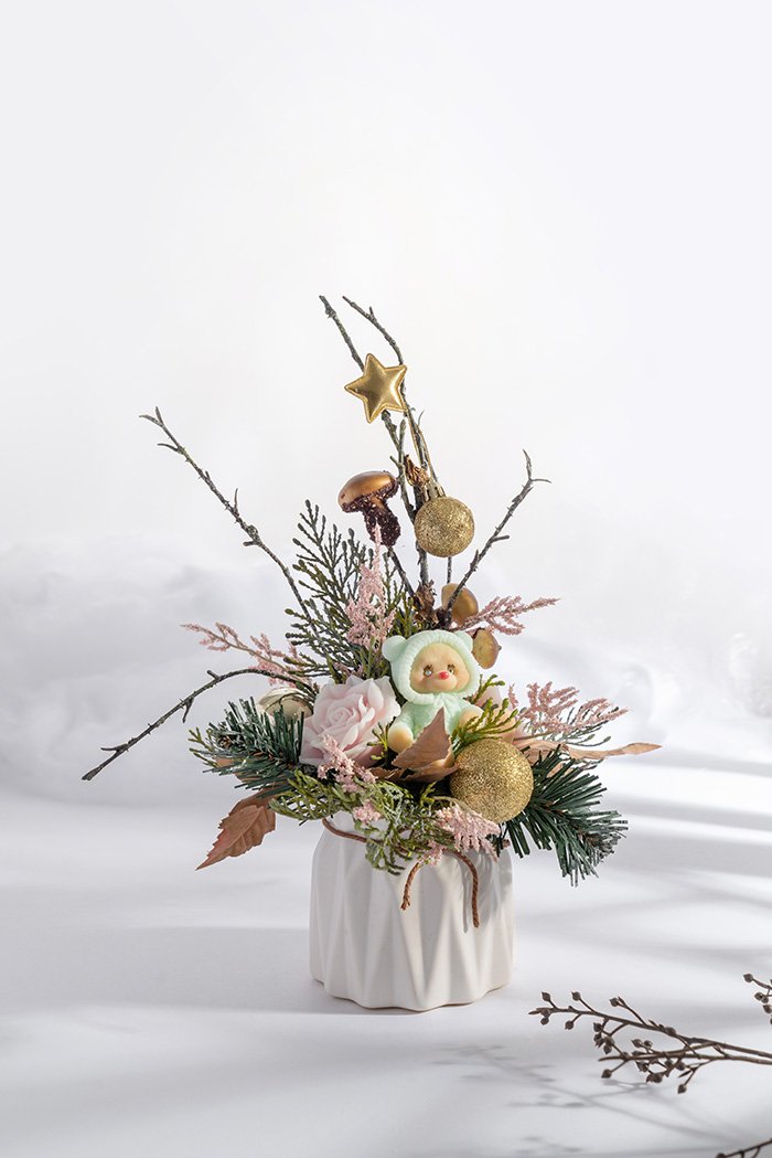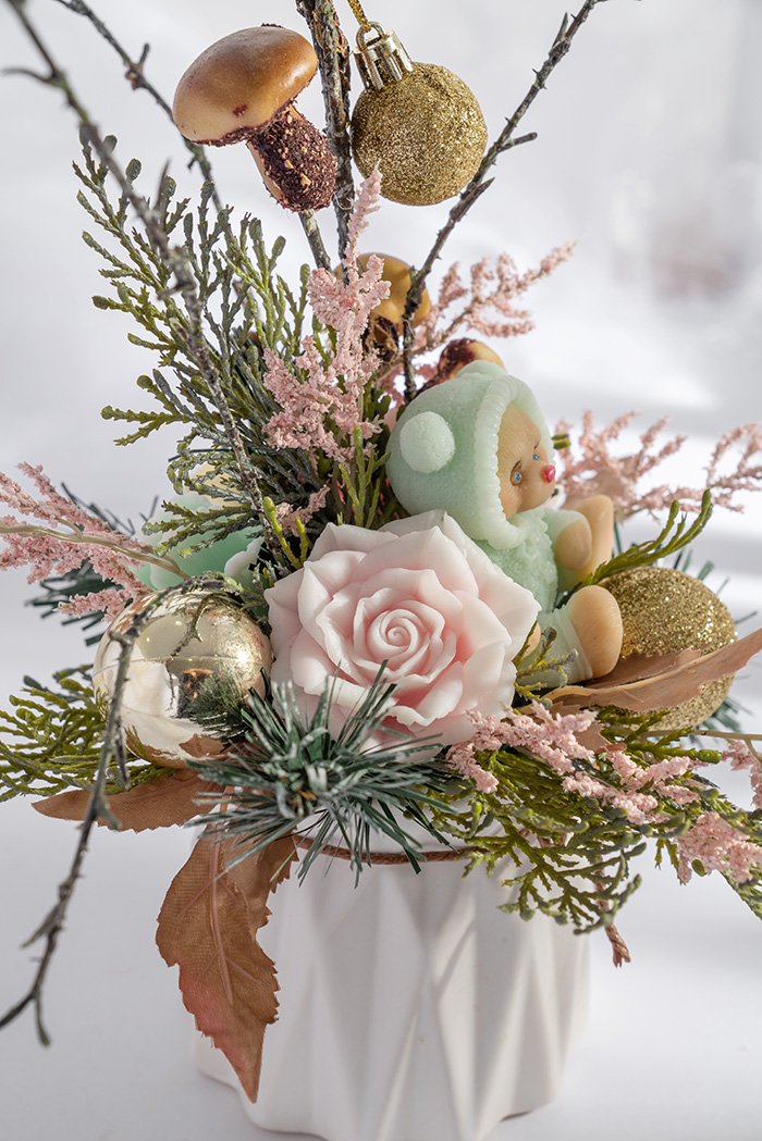 White gypsum vase with Christmas decorations and four pieces of natural scented soap.