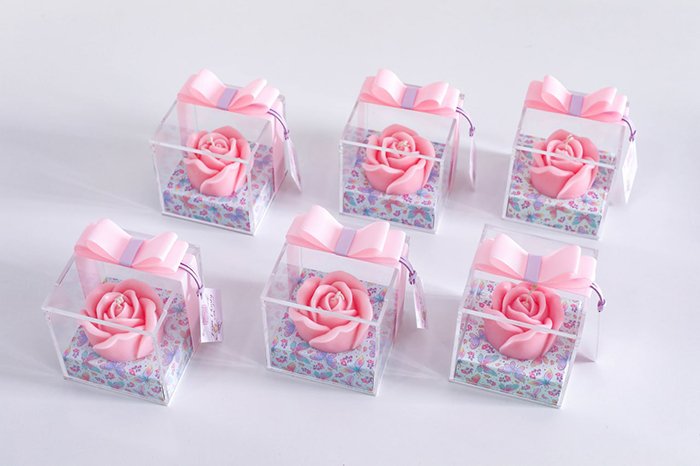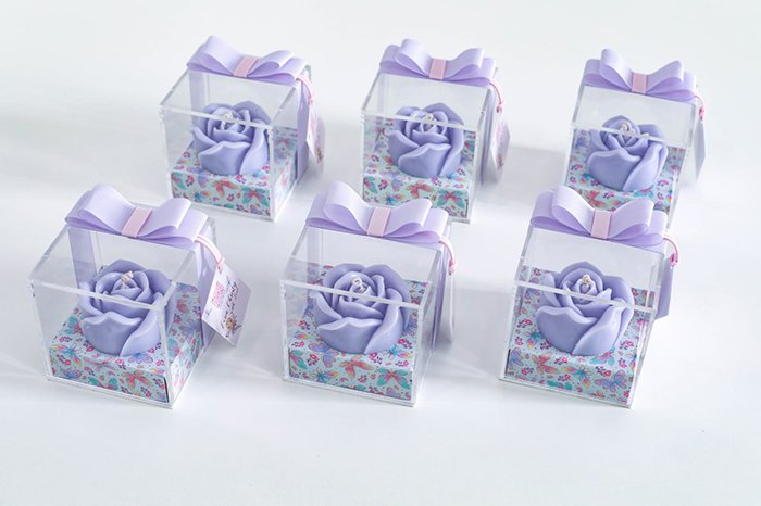 The packaging comes in a clear acrylic box size 8cm x 8cm x 10cm, with a ribbon and greeting card
