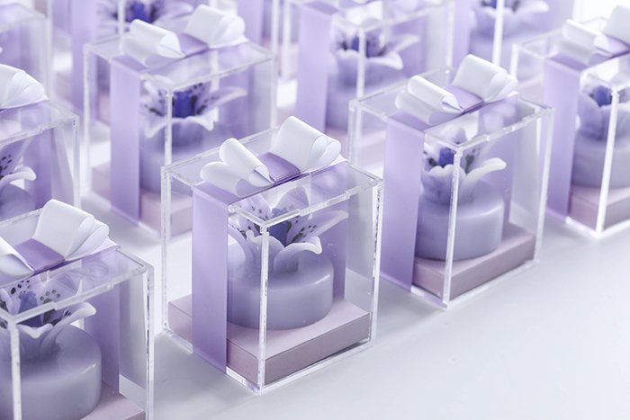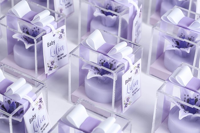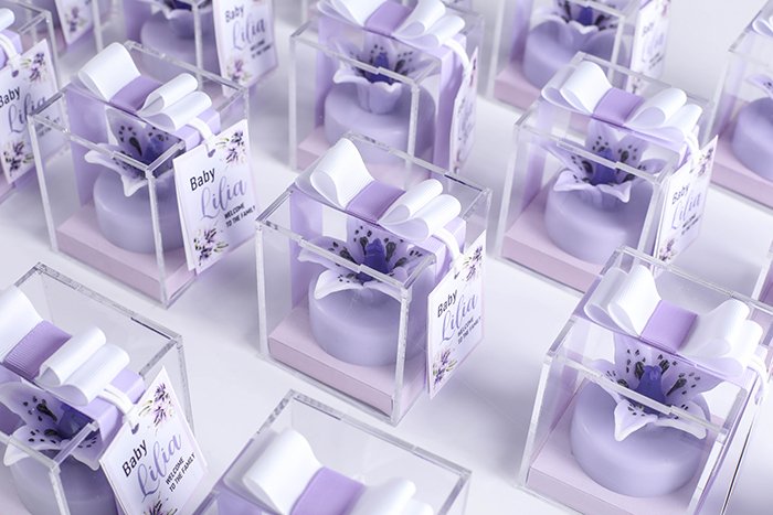 The packaging comes in a clear acrylic box size 7cm x 7cm x 10cm, with ribbon, and a greeting card.