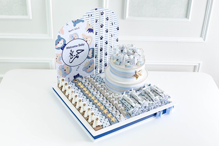 – 1.5 KG of square Belgian chocolates in different fillings (almond, hazelnut, wafer, pistachio, salted caramel) with customized wrapping papers and accessories.