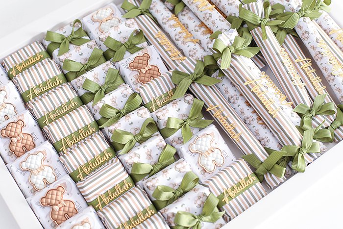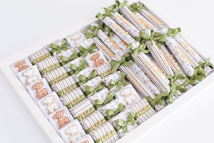 – 400 G of Belgian chocolate fingers in different fillings (almond, wafer, pistachio) with customized wrapping paper, decorated with acrylic names.