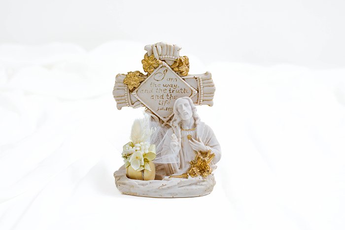 Jesus with cross giveaway, made of resin, size 12cm x 17cm H.