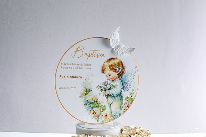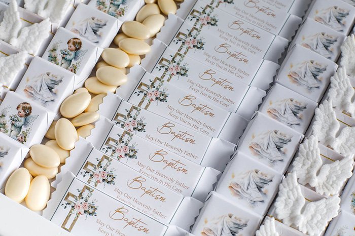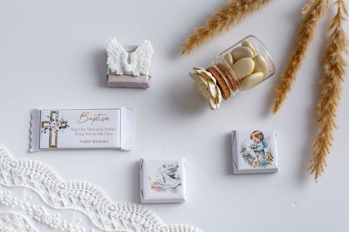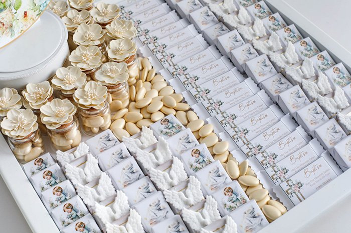 – 15 glass jars of gold dragees, decorated with fabric flower.