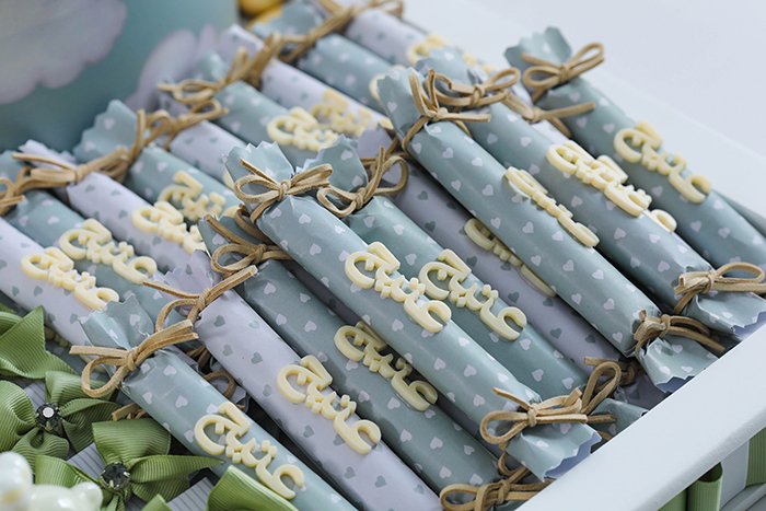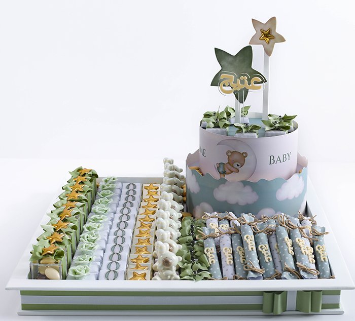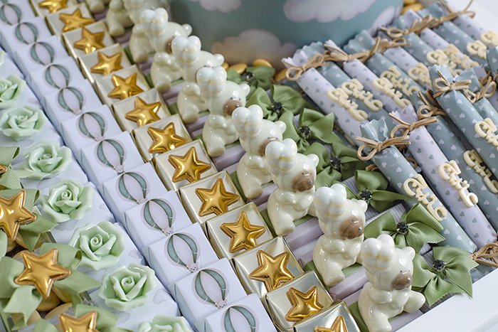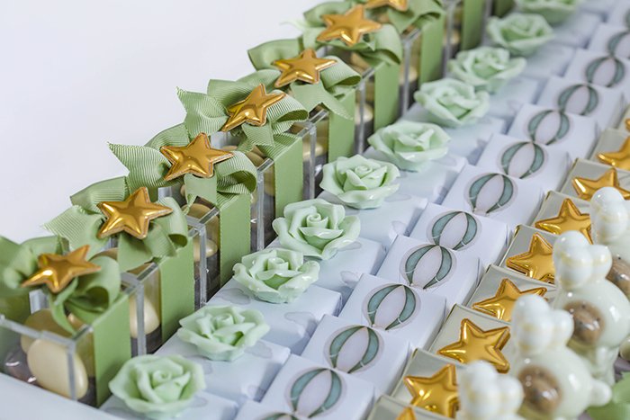 – 10 boxes of dragée (chocolate-coated sugar) decorated with light green ribbon and gold star.