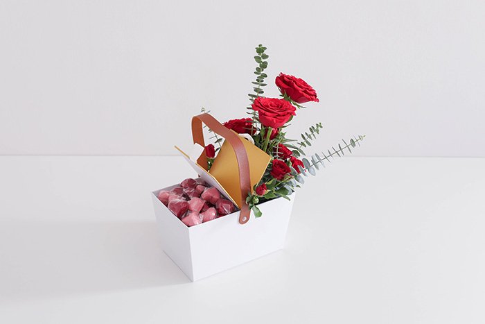 with a flower arrangement of red roses