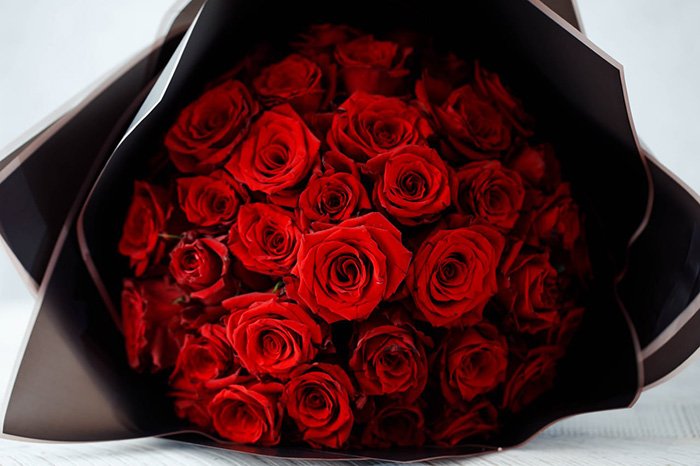40 pieces of red fresh flower in a round bouquet with black paper.