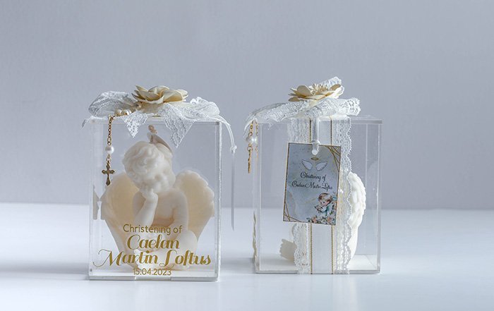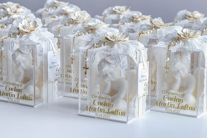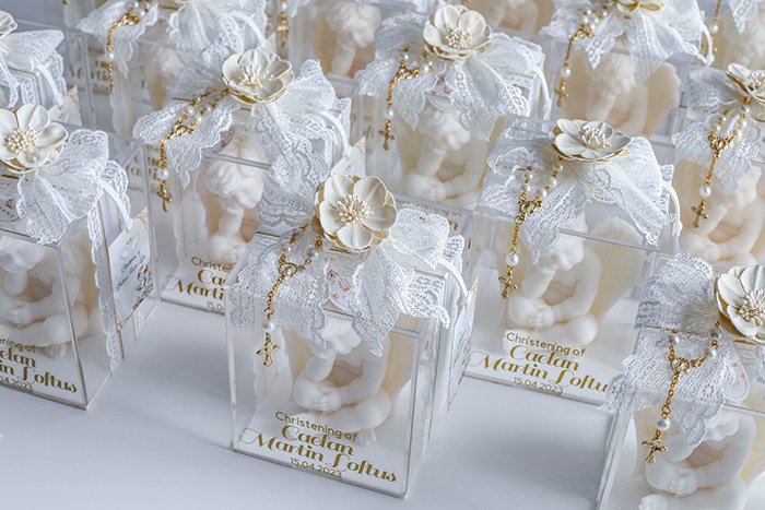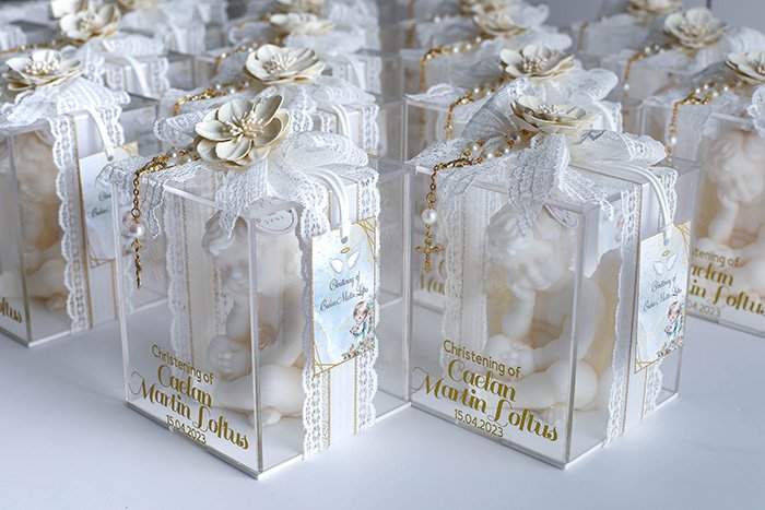 The packaging comes in a clear acrylic box size 11cm x 11cm x 13cm, with ribbon, rosary, and fabric flower.
