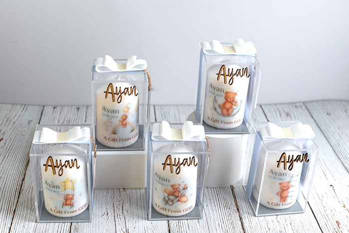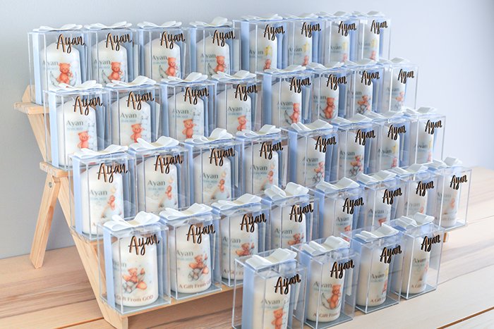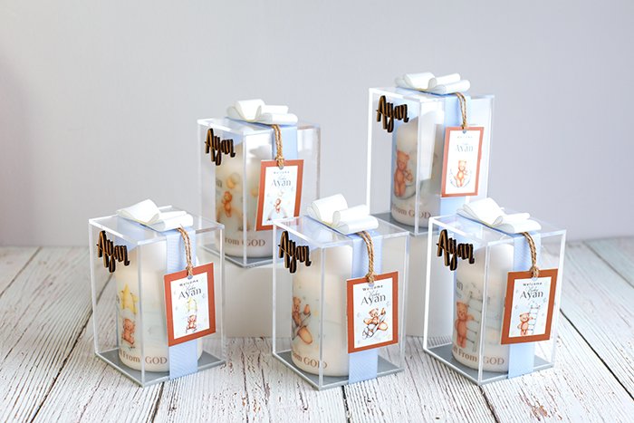 The packaging comes in a clear acrylic box size 10cm x 10cm x 12cm, with ribbon, acrylic baby name and greeting card.