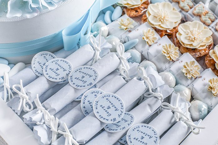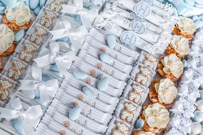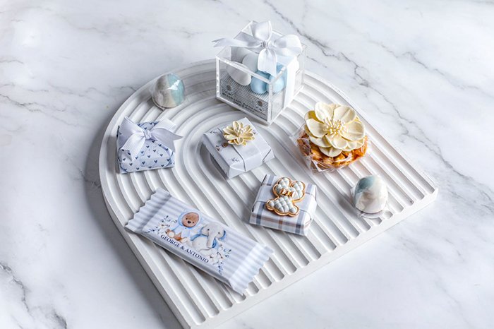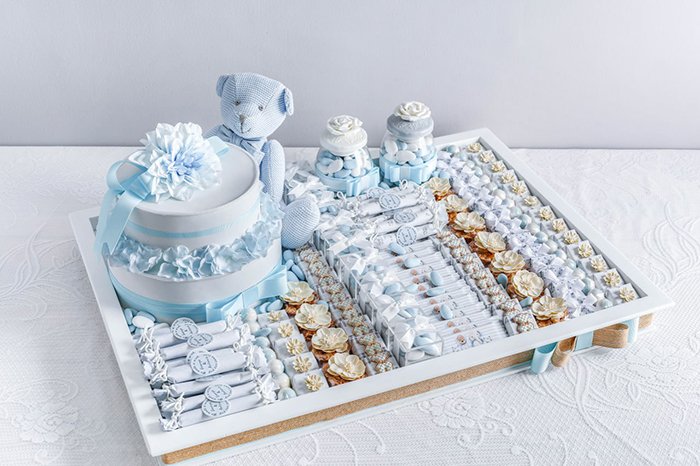 – 10 acrylic boxes filled with blue dragees (chocolate coated sugar)