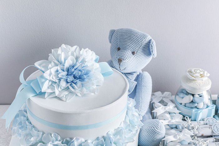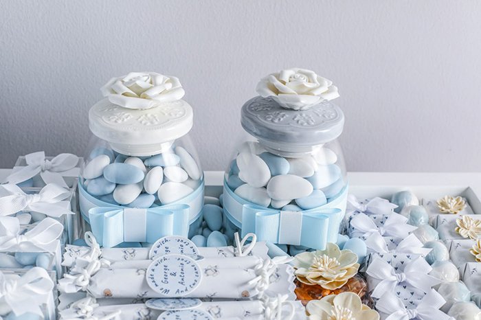 – Two decorated glass jars filled with 1 Kg of blue and white dragees (chocolate coated sugar)
