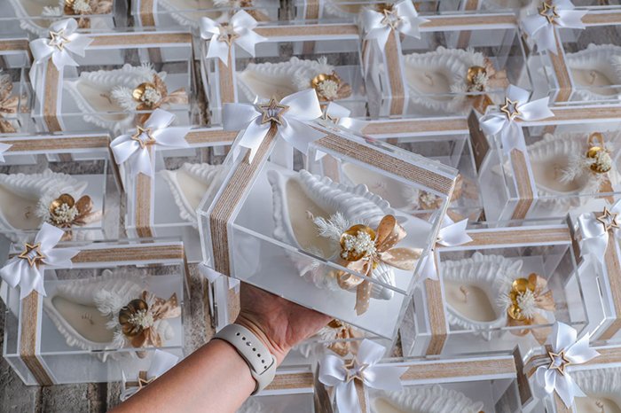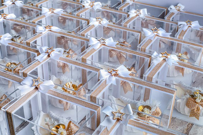 The packaging comes in a clear acrylic box size 19cm x 13cm x 9cm, with ribbon, flowers, and greeting card